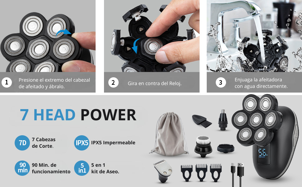 La herramienta definitiva para el cuidado personal masculino. Diseñada para hombres entre 30 y 65 años que buscan una afeitadora eficiente, versátil y fácil de usar. Con 7 cabezales de corte y tecnología avanzada, obtén un afeitado rápido, suave y preciso, sin importar tu tipo de piel o estilo de barba.